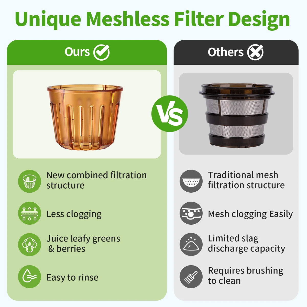 【Efficient Filtration Design】AIRMSEN vertical juicer features a unique meshless filter. Its 0.1mm toothed grinding structure effectively reduces blockages and perfectly separate the pomace from the juice, resulting in a juice purity of up to 99%. Less pulp and a smooth taste.