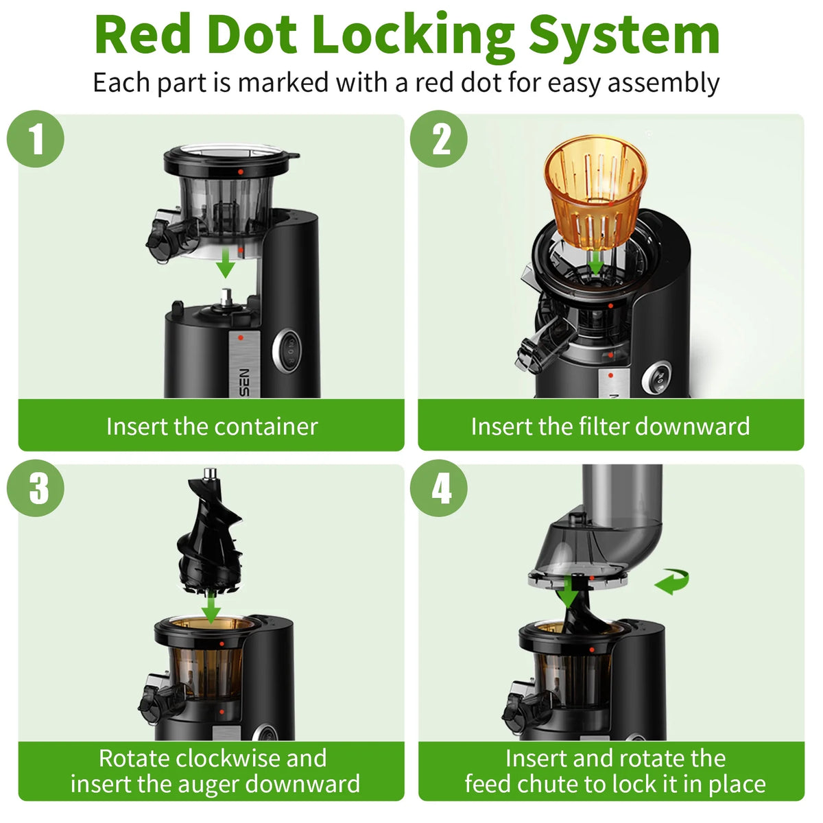 【Easy to Assemble & Clean】With the red dot locking system, assembly takes only a few seconds, making it ideal for beginners and elderly. Revolutionary meshless filter ensures a scrub-free cleaning experience with no clogged up pulp. All of the juicer's plastic parts are dishwasher safe.