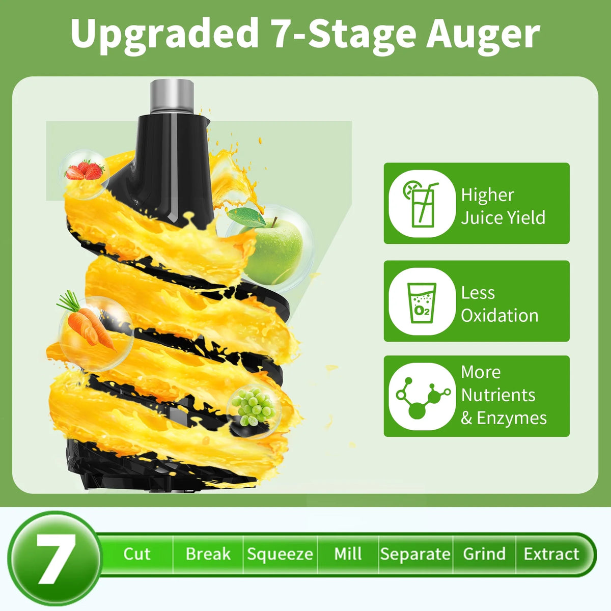 【Slow Cold Press Tech】The slow juicer rotates at only 60 RPM, minimizing heat build-up and oxidation, preserve the natural state of the juice. 7-stage spiral auger mimics the motion of hand squeezing juice, and increasing juice yield by over 60%. Enjoy the benefits of high quality, long-lasting freshness from slow extraction.
