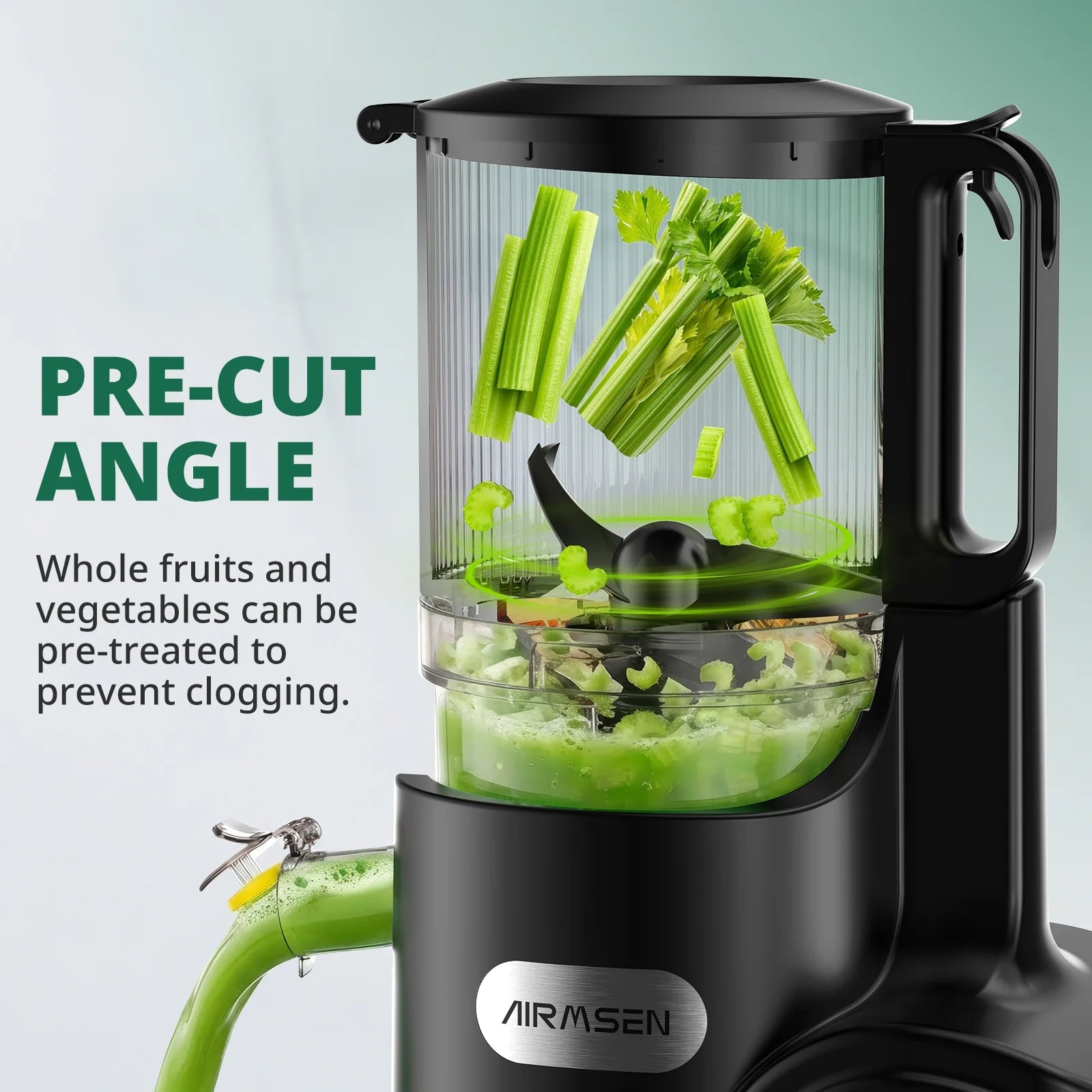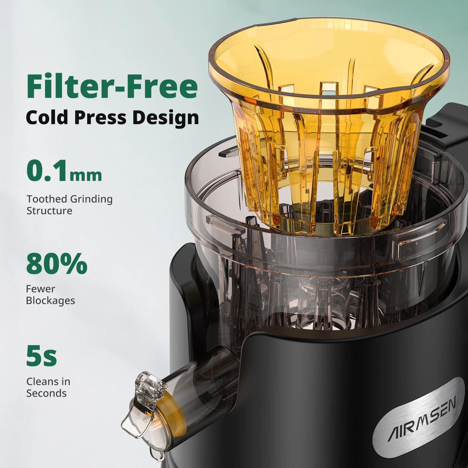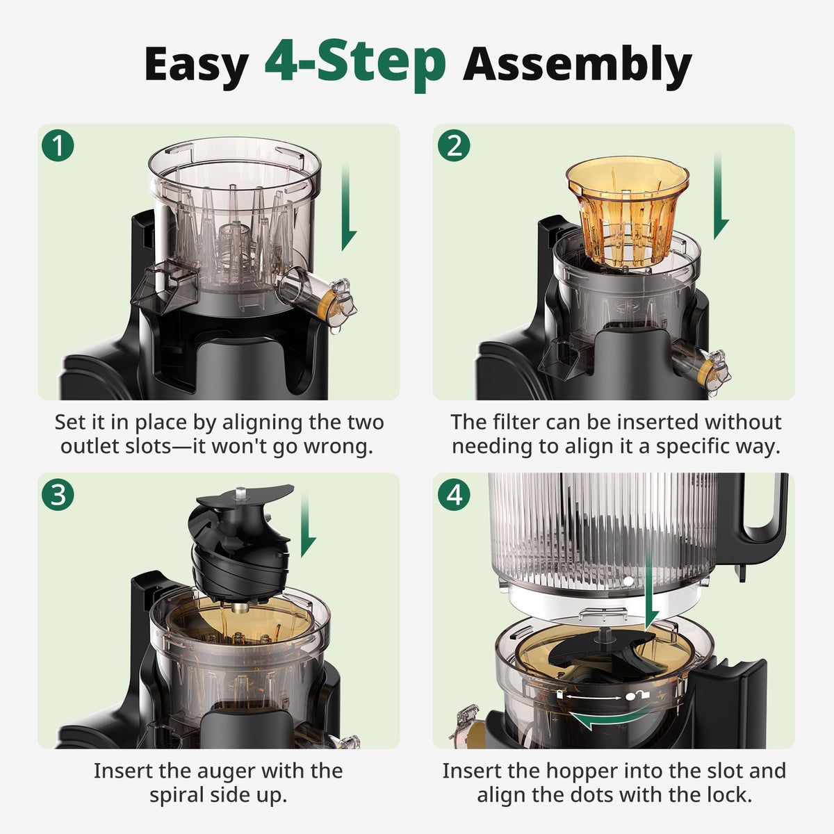 [Fast Assembly & Clean-Up!]: This AIRMSEN masticating juicer is primarily composed of 4 detachable parts, making assembly and disassembly a breeze—taking only seconds to set up, even for beginners. There are no hard-to-reach corners, no complicated parts to remove, and no long waiting times before you can use it again. Simply clean quickly and easily, and you're ready for the next refreshing juice session!